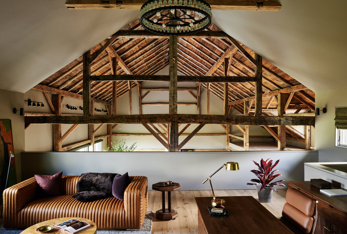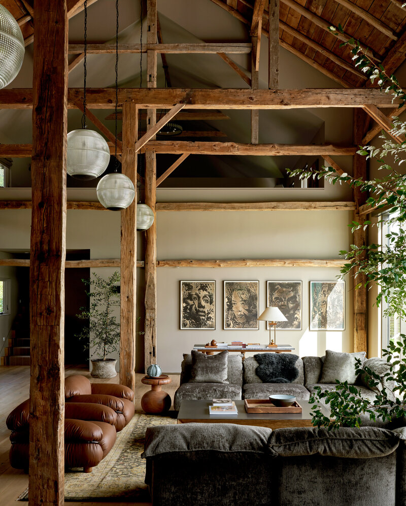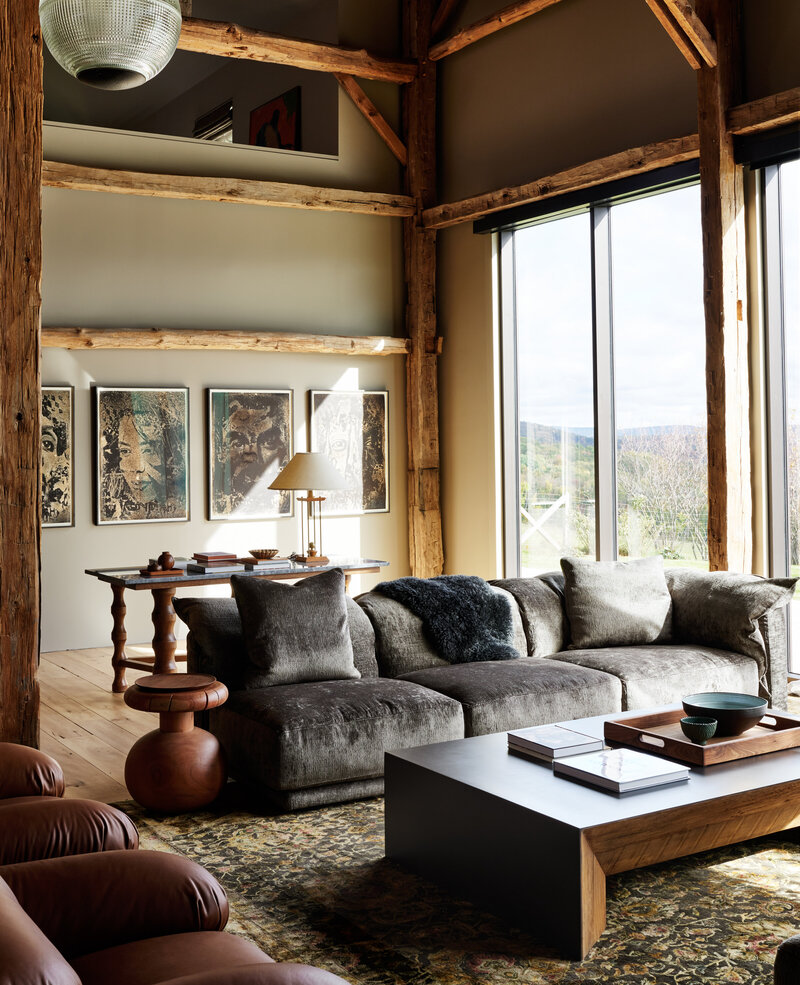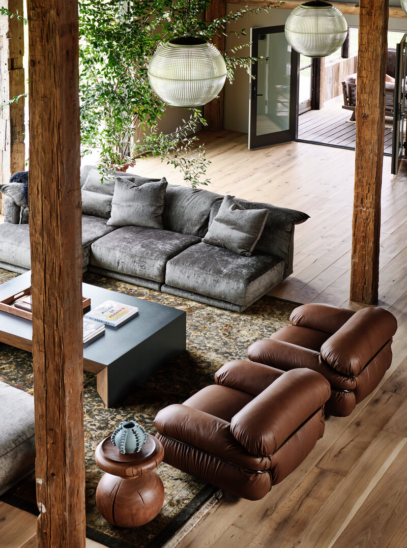 The great room was all about honoring the view. The original barn had incredible bones but felt chaotic with its sprawling beams and vast volume, so our focus was on calming the architecture and letting the landscape take the lead. We expanded the glazing as much as possible and kept the materials as supporting cast. Layered furnishings, unexpected textures, and pieces from different eras brought warmth back into the space without competing with the surroundings.