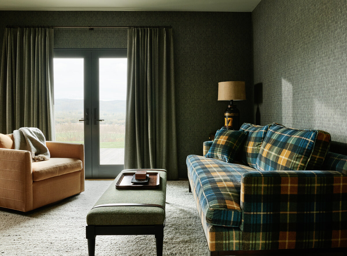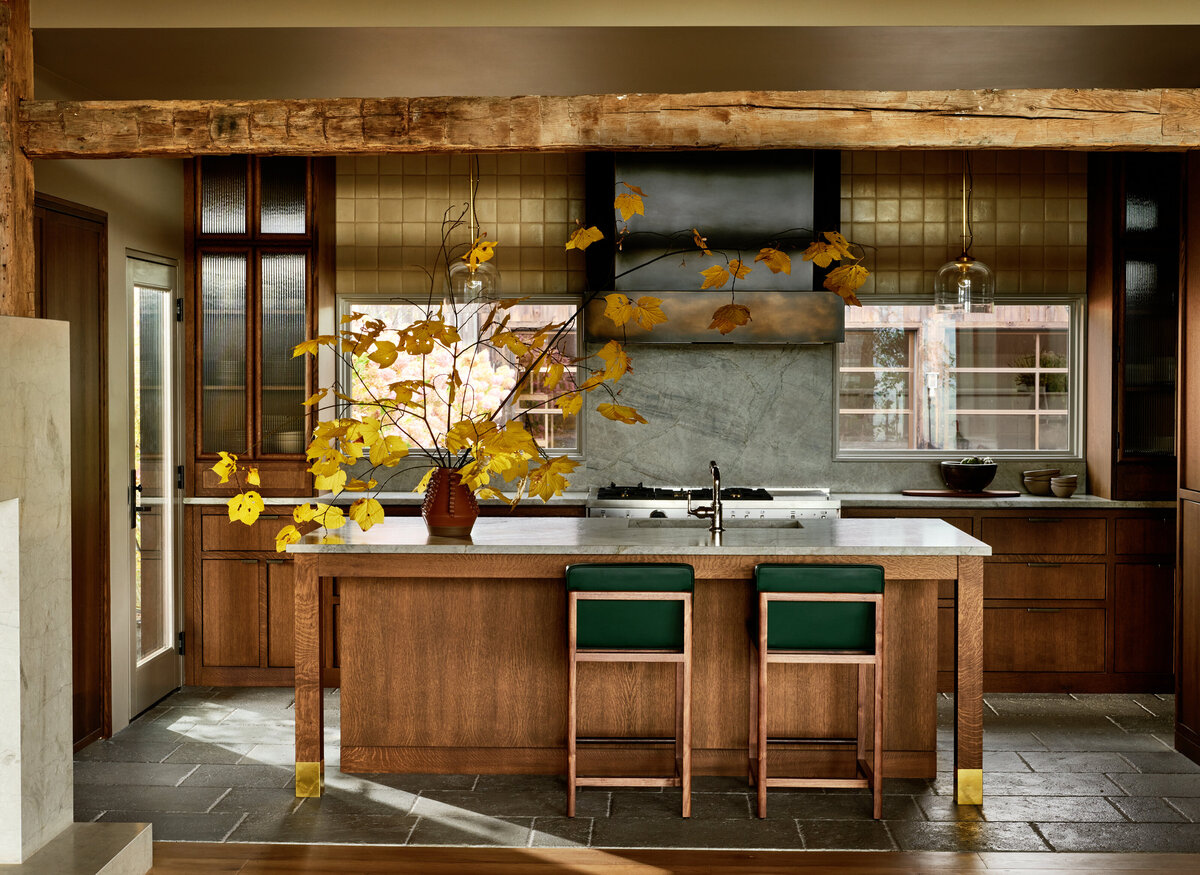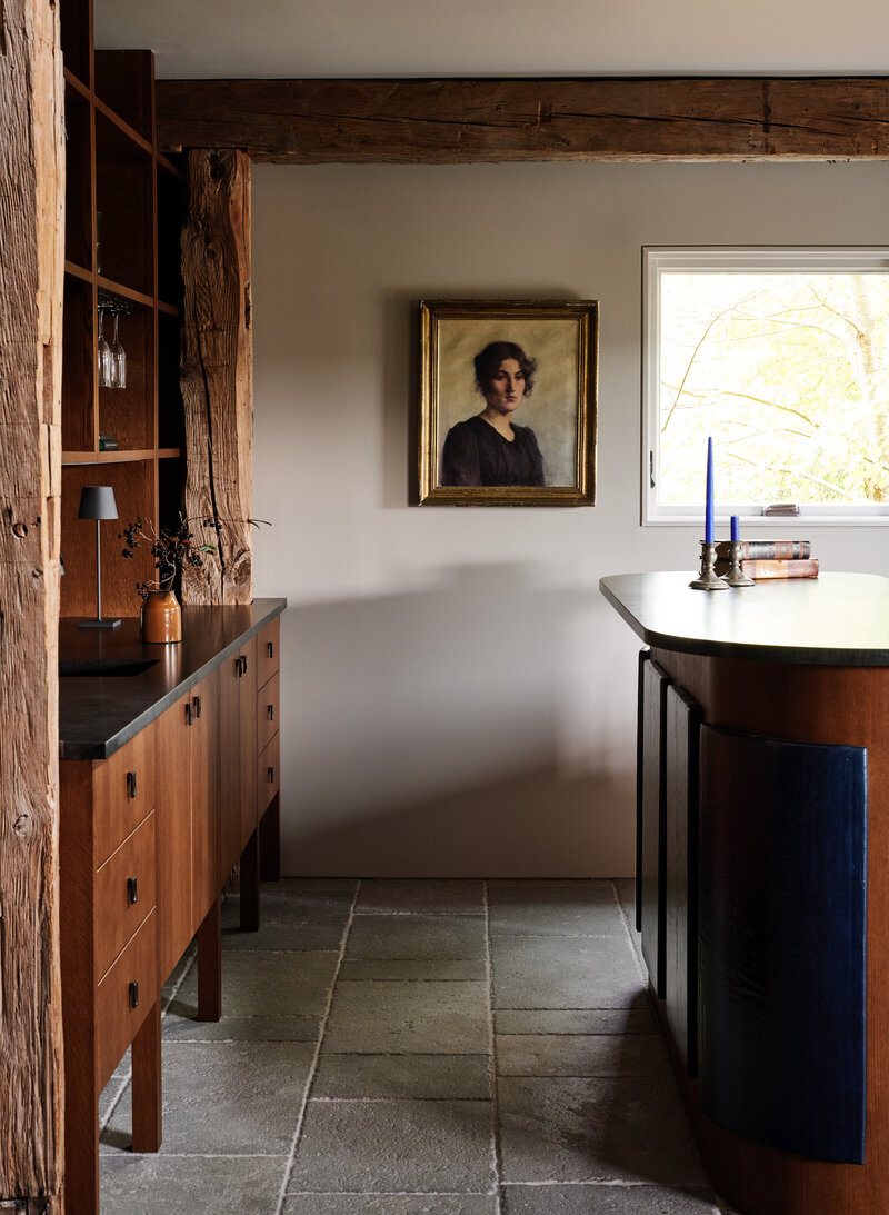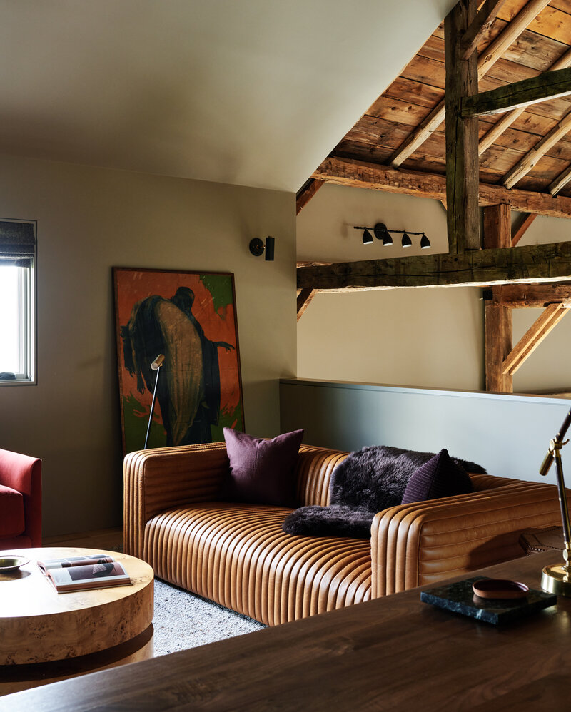 The great room was all about honoring the view. The original barn had incredible bones but felt chaotic with its sprawling beams and vast volume, so our focus was on calming the architecture and letting the landscape take the lead. We expanded the glazing as much as possible and kept the materials as supporting cast. Layered furnishings, unexpected textures, and pieces from different eras brought warmth back into the space without competing with the surroundings.
