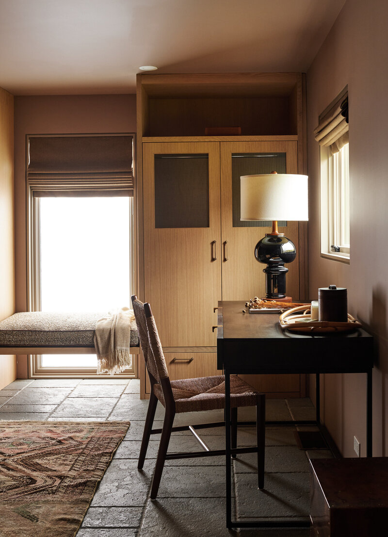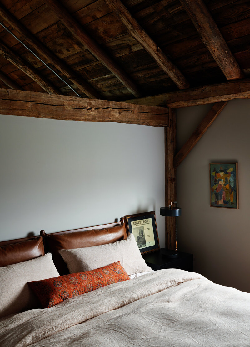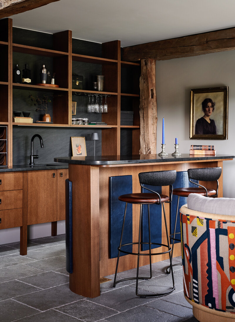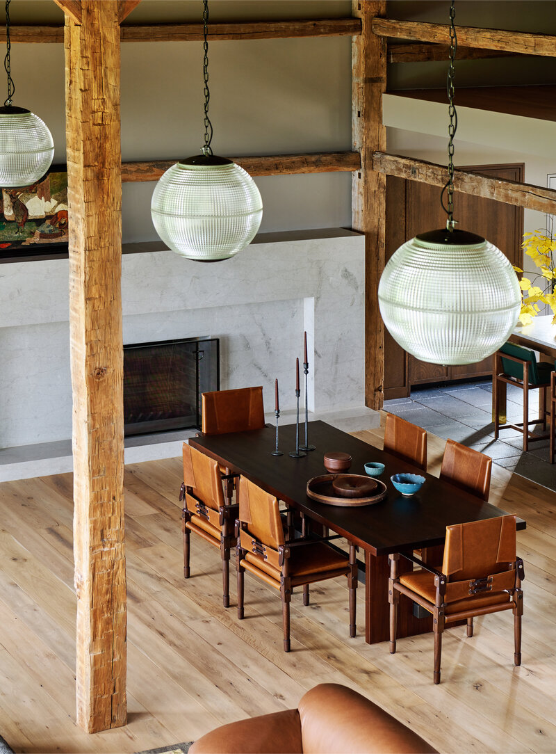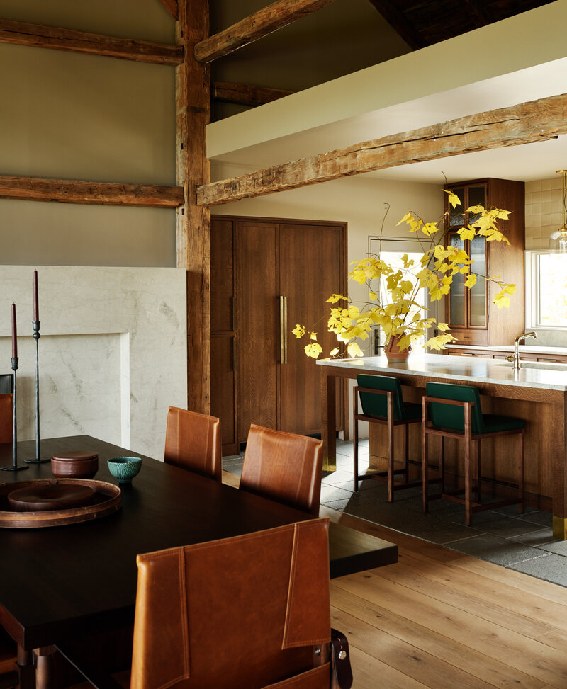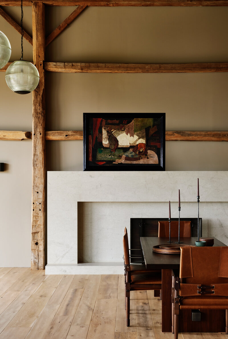 Instead of a long, formal dining setup, we created a more intimate area anchored by the fireplace, with detailed chairs and soft lighting that suit smaller gatherings. The bar and entertaining spaces follow the same approach. Rustic beams, reclaimed wood, and historic fixtures mix with quieter, modern elements, blending eras in a way that feels collected rather than styled. The goal was a place where the client could unwind, work in peace, or host a cozy dinner without shifting the mood of the home.