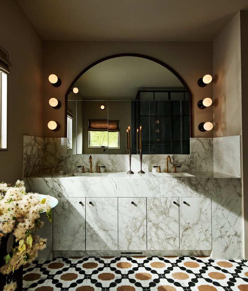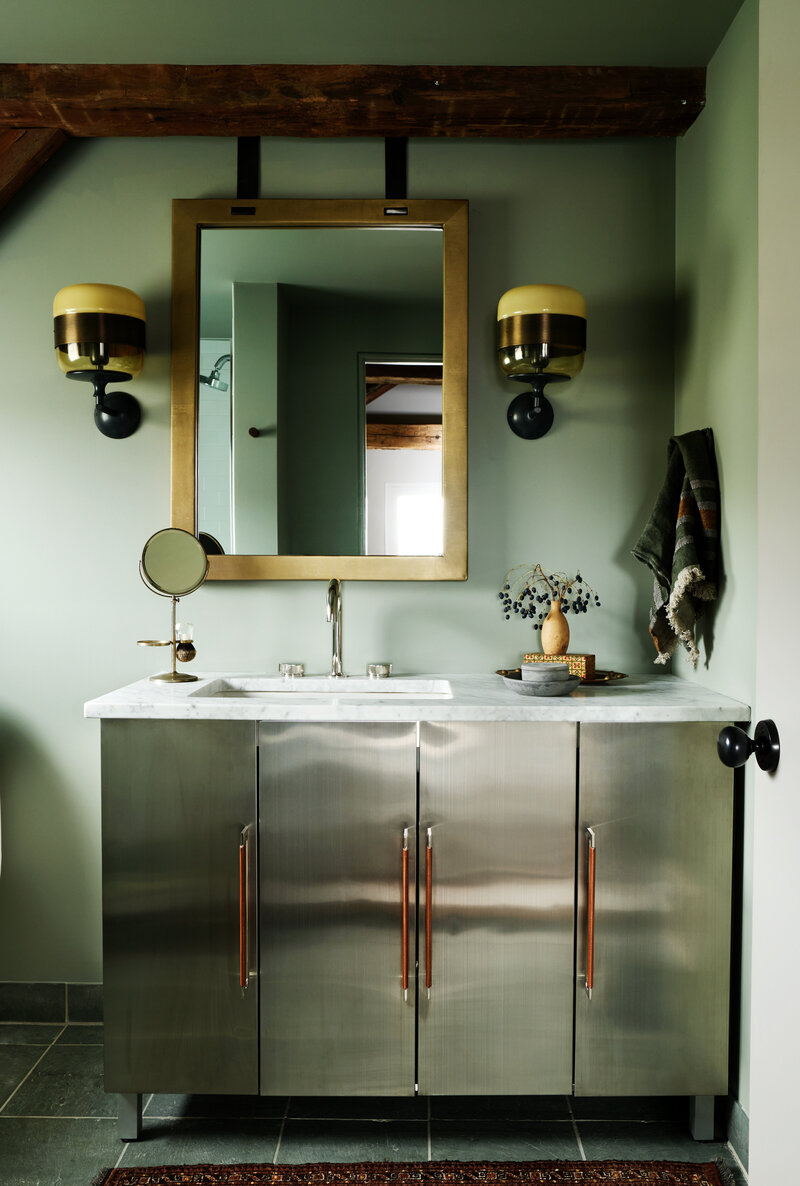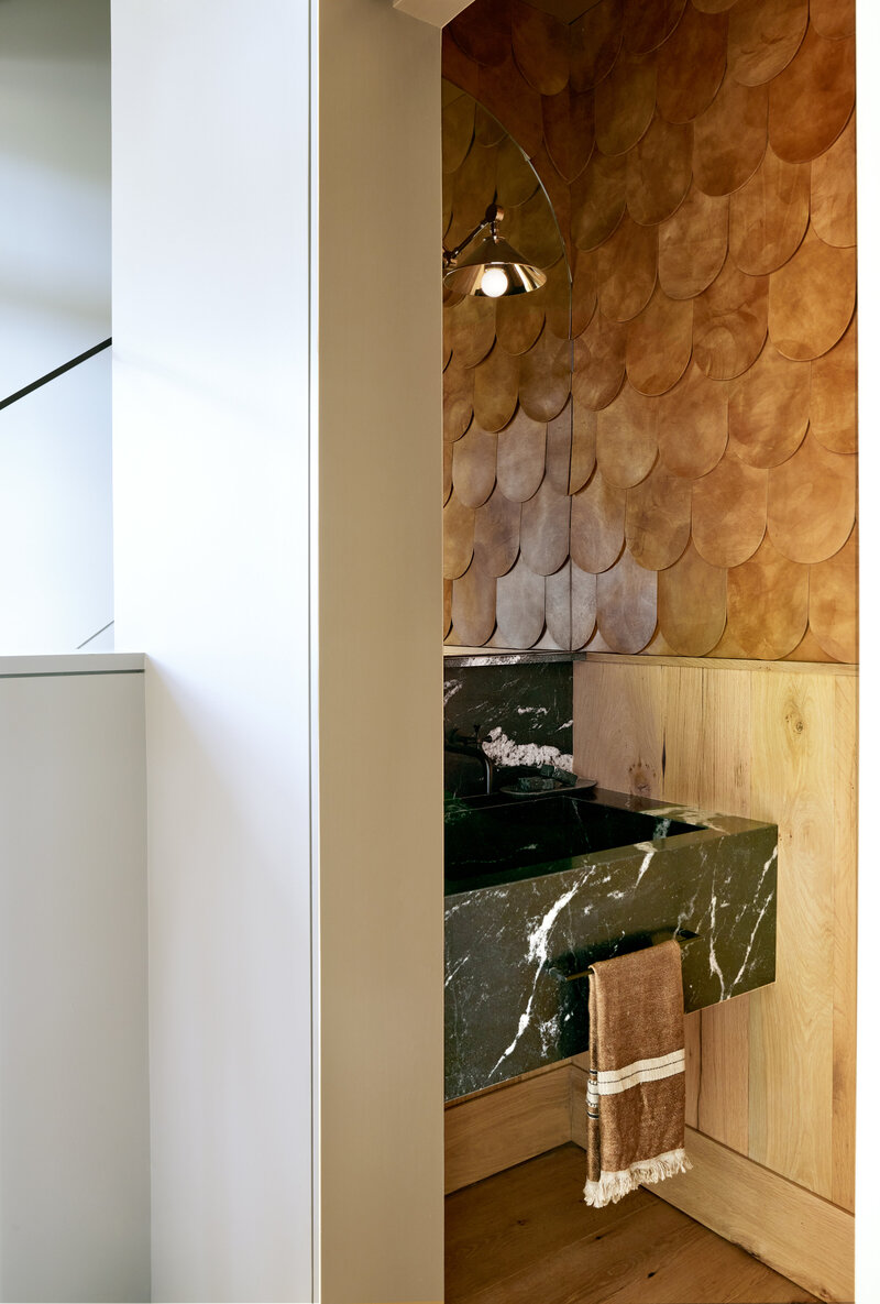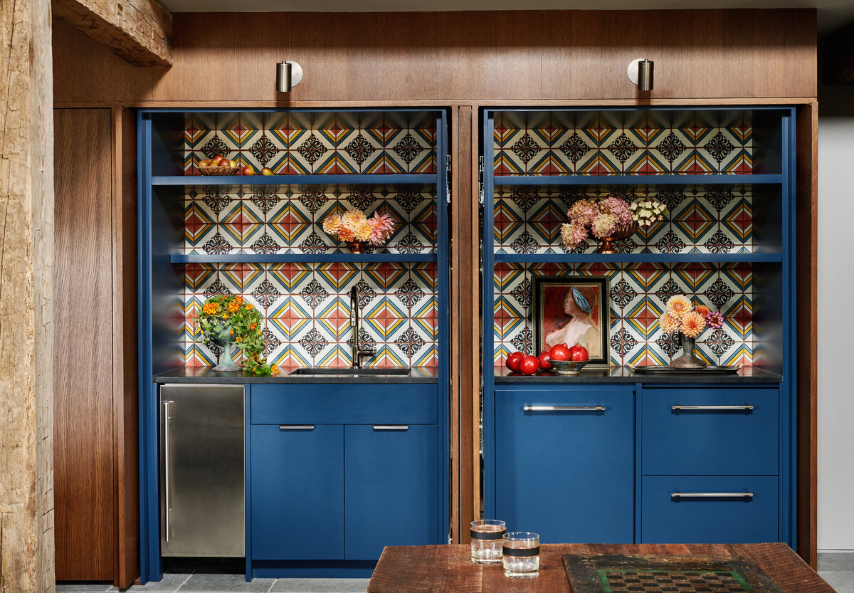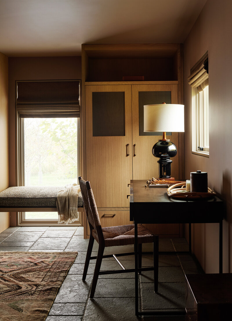 Instead of a long, formal dining setup, we created a more intimate area anchored by the fireplace, with detailed chairs and soft lighting that suit smaller gatherings. The bar and entertaining spaces follow the same approach. Rustic beams, reclaimed wood, and historic fixtures mix with quieter, modern elements, blending eras in a way that feels collected rather than styled. The goal was a place where the client could unwind, work in peace, or host a cozy dinner without shifting the mood of the home.