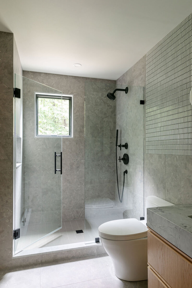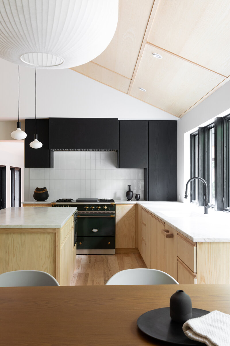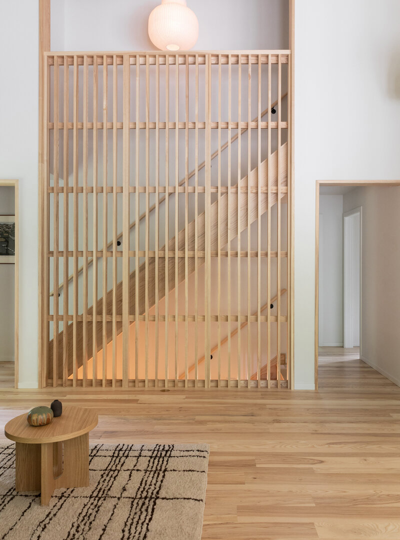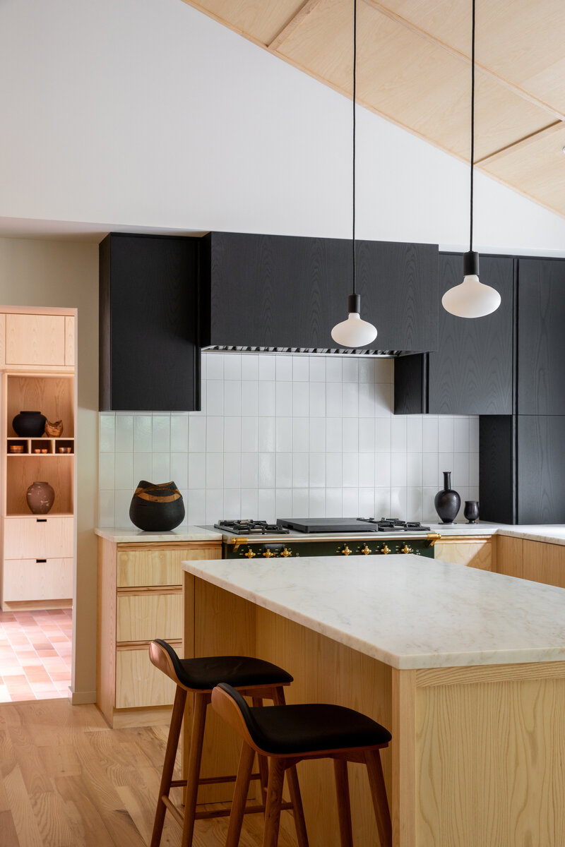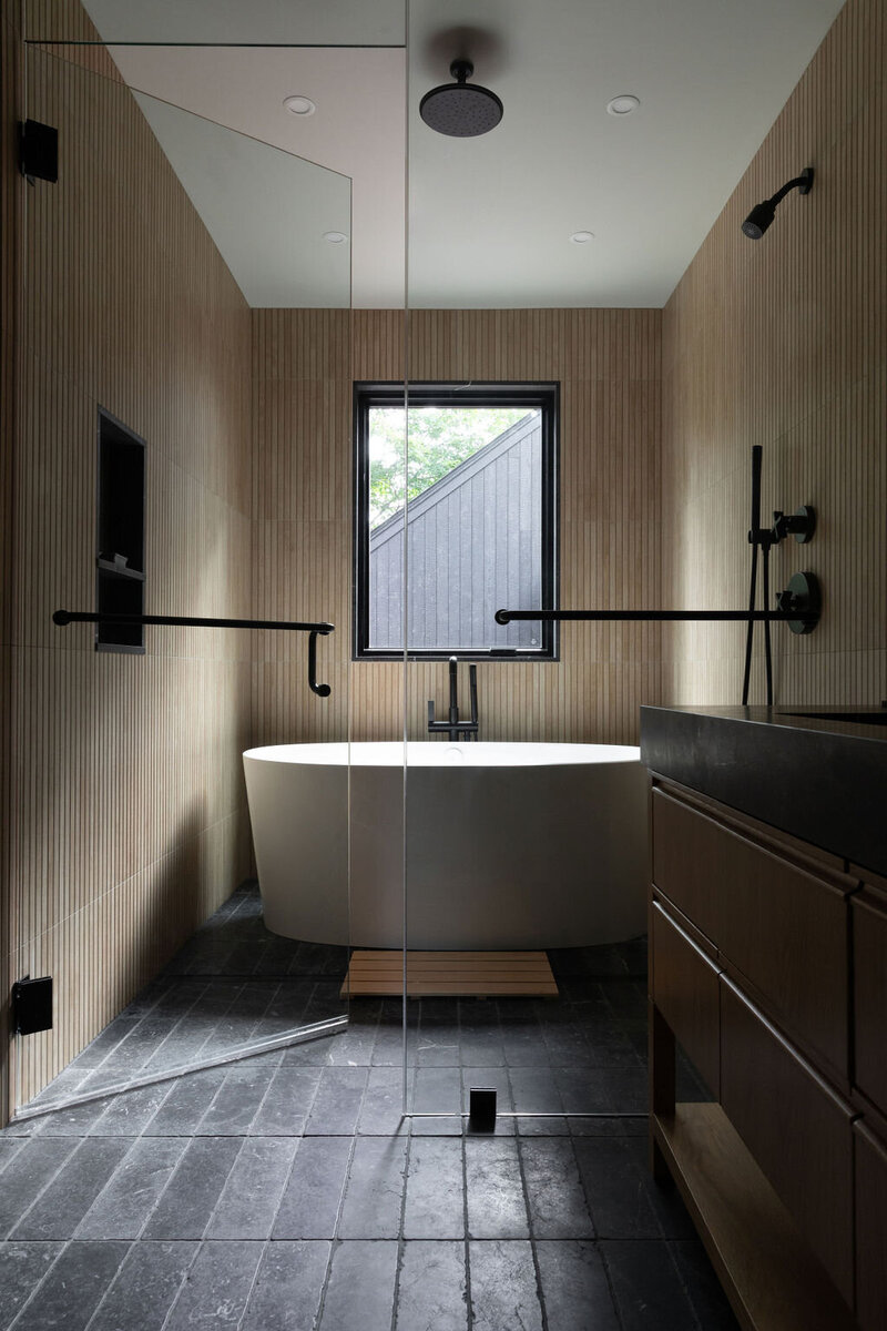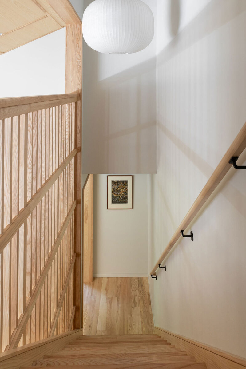 This project transformed a modest 1980’s home into a dynamic Japanese Modern structure that utilizes every inch of space for a multi-generational family. Ash wood from felled trees on the client’s previous property clad the ceilings and a traditional japanese wet room serves as the primary bathroom.
