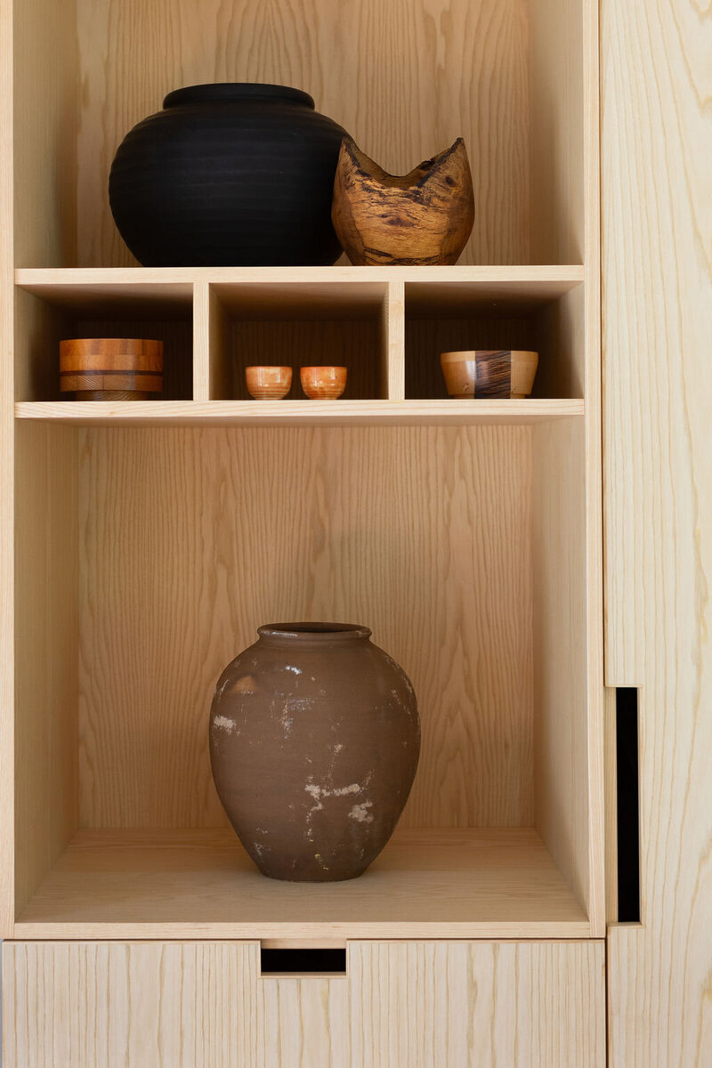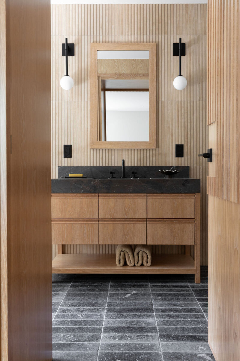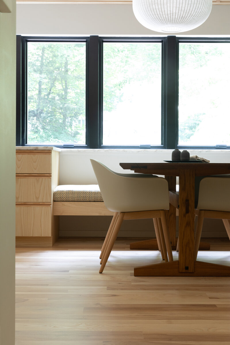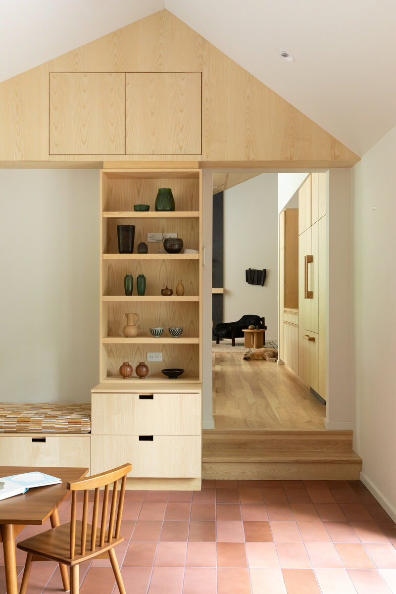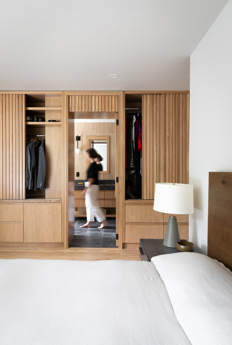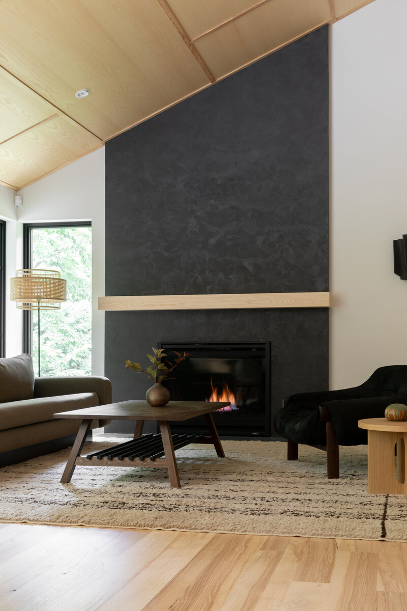 This project transformed a modest 1980’s home into a dynamic Japanese Modern structure that utilizes every inch of space for a multi-generational family. Ash wood from felled trees on the client’s previous property clad the ceilings and a traditional japanese wet room serves as the primary bathroom.